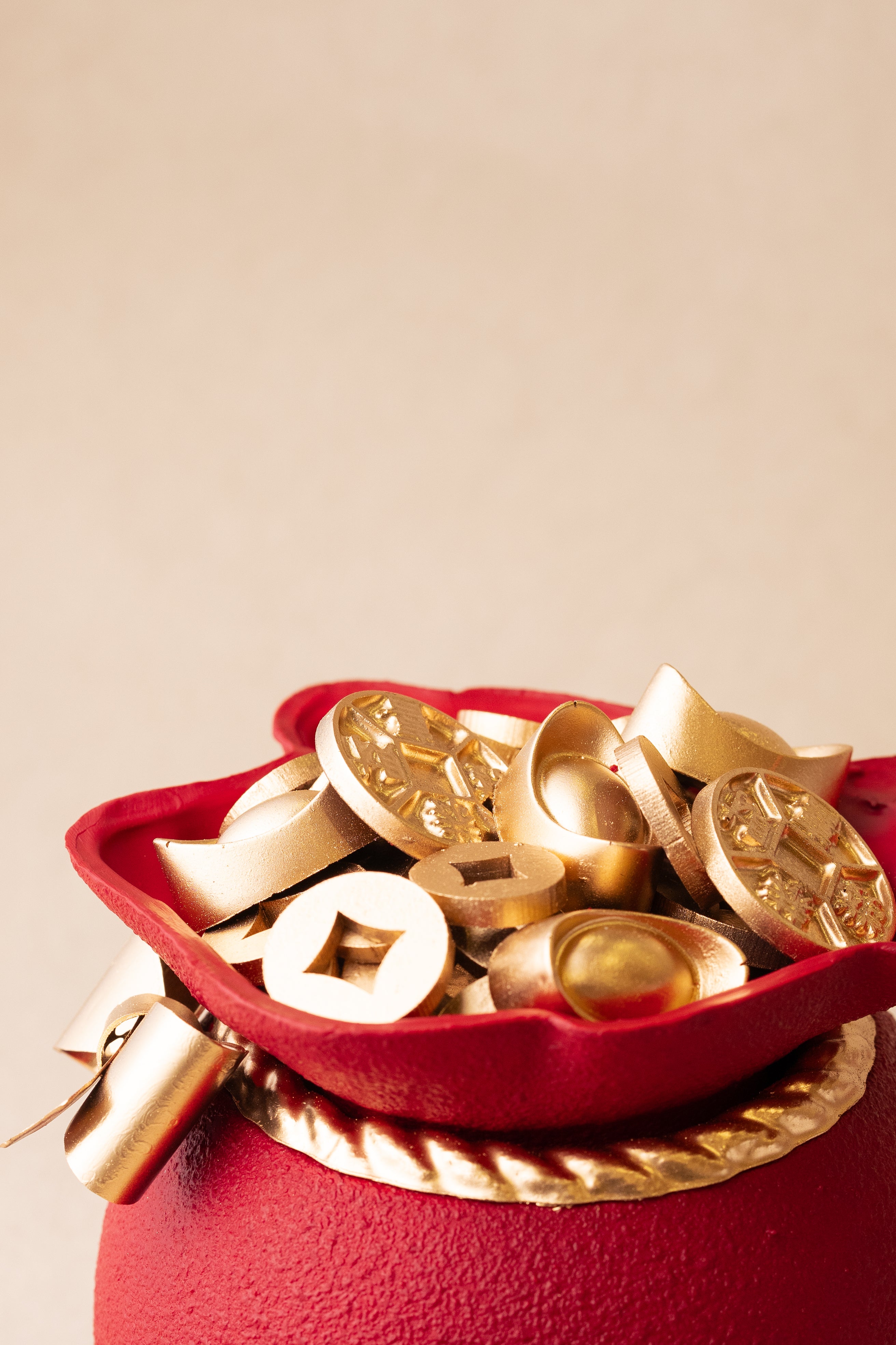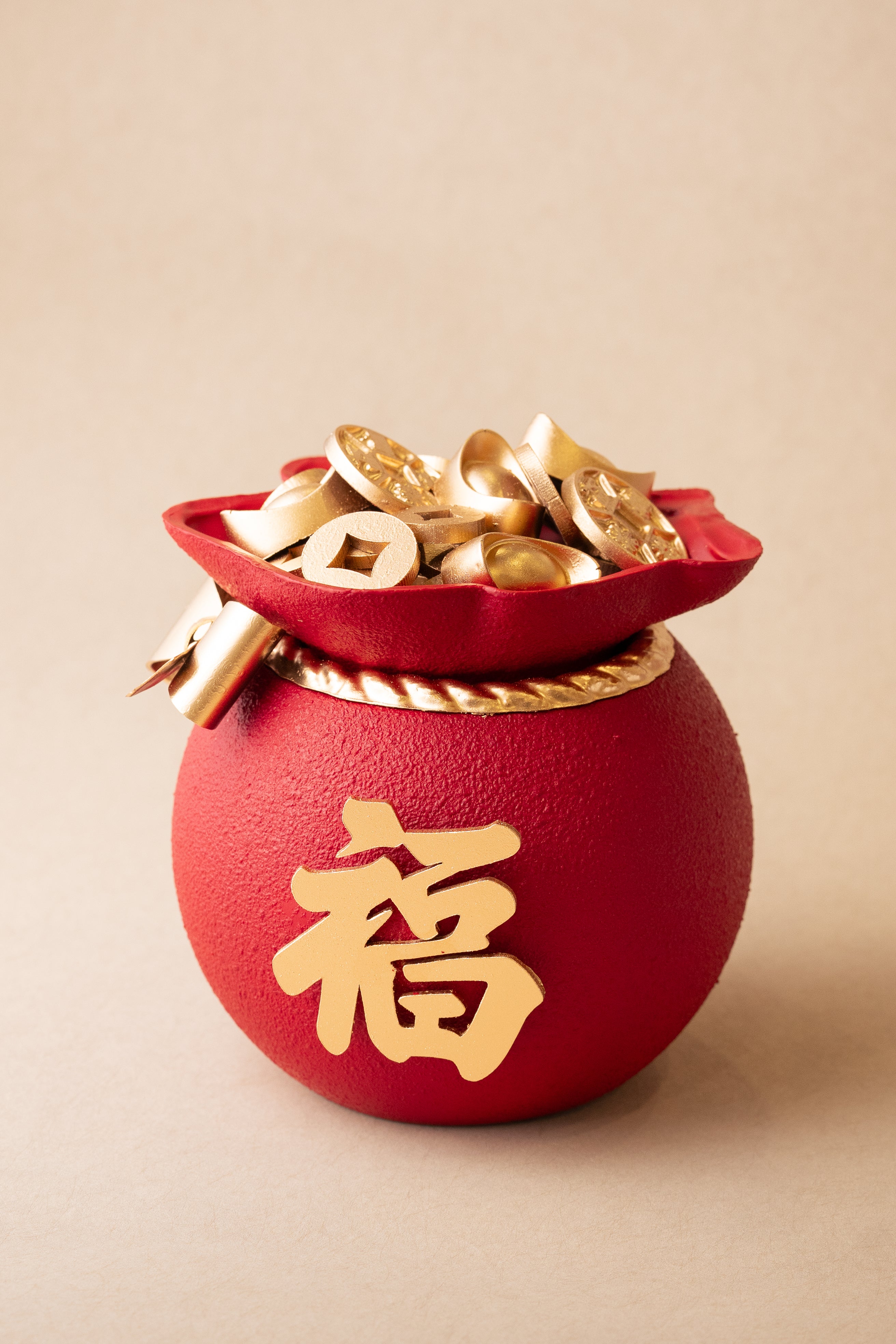 Prosperity Pouch: A centerpiece of 53% Dark Chocolate, finished with a shimmering coat of edible gold to invite wealth and radiance.