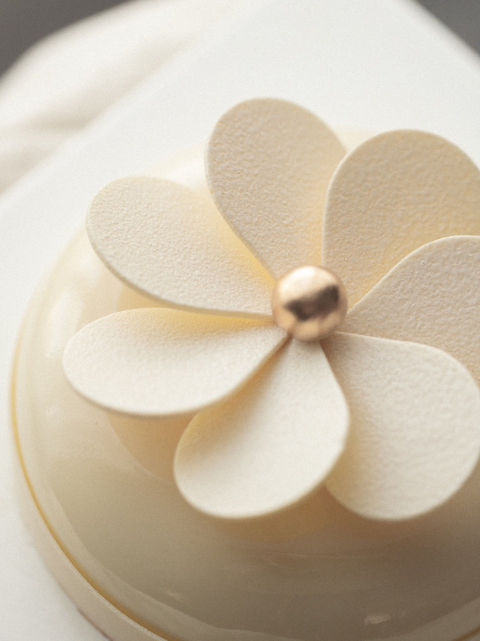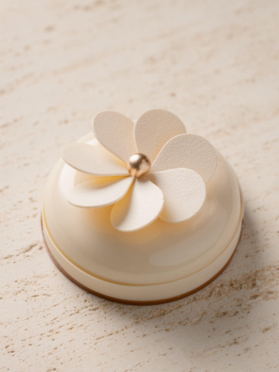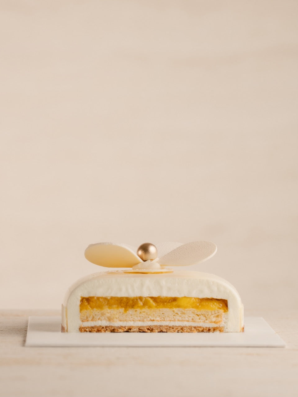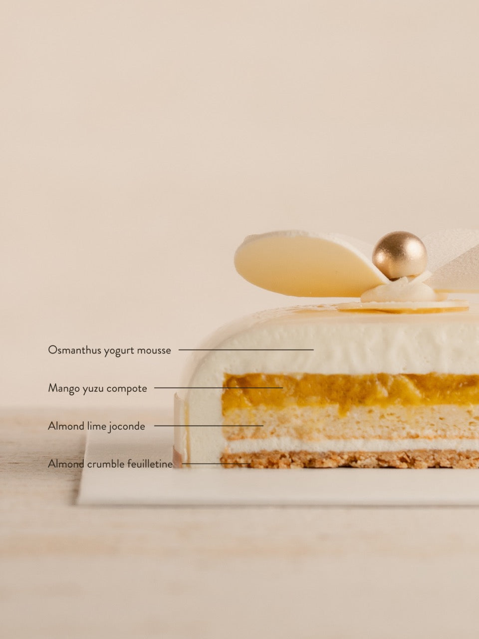 Drawing from East Asian ingredients, this cake weaves together the subtle sweetness of Osmanthus with the bright, tropical notes of mango and yuzu. Yogurt lends a gentle tang that softens the fruit’s richness, while lime adds a lift of citrus, creating a light, fragrant dessert with a graceful floral finish.