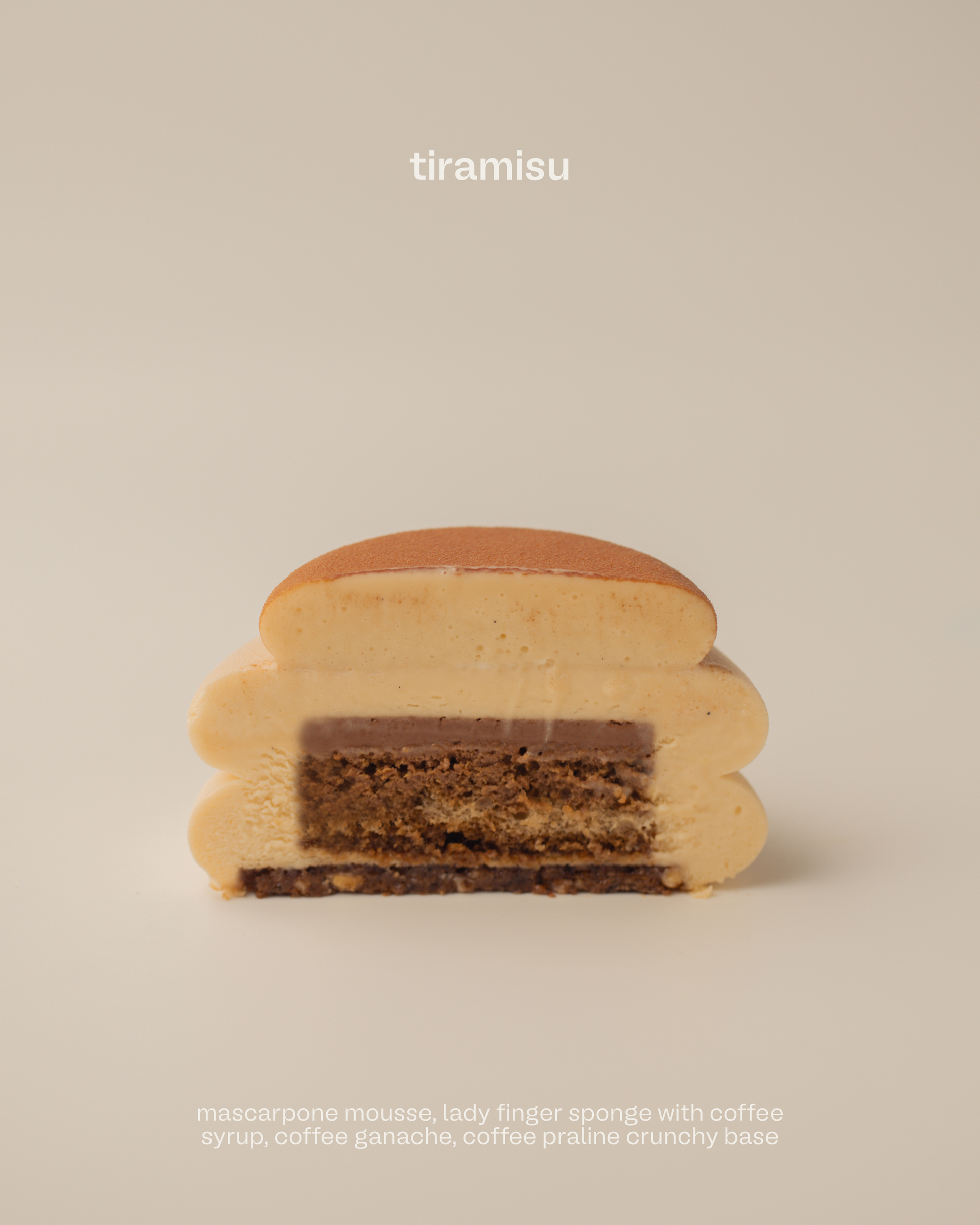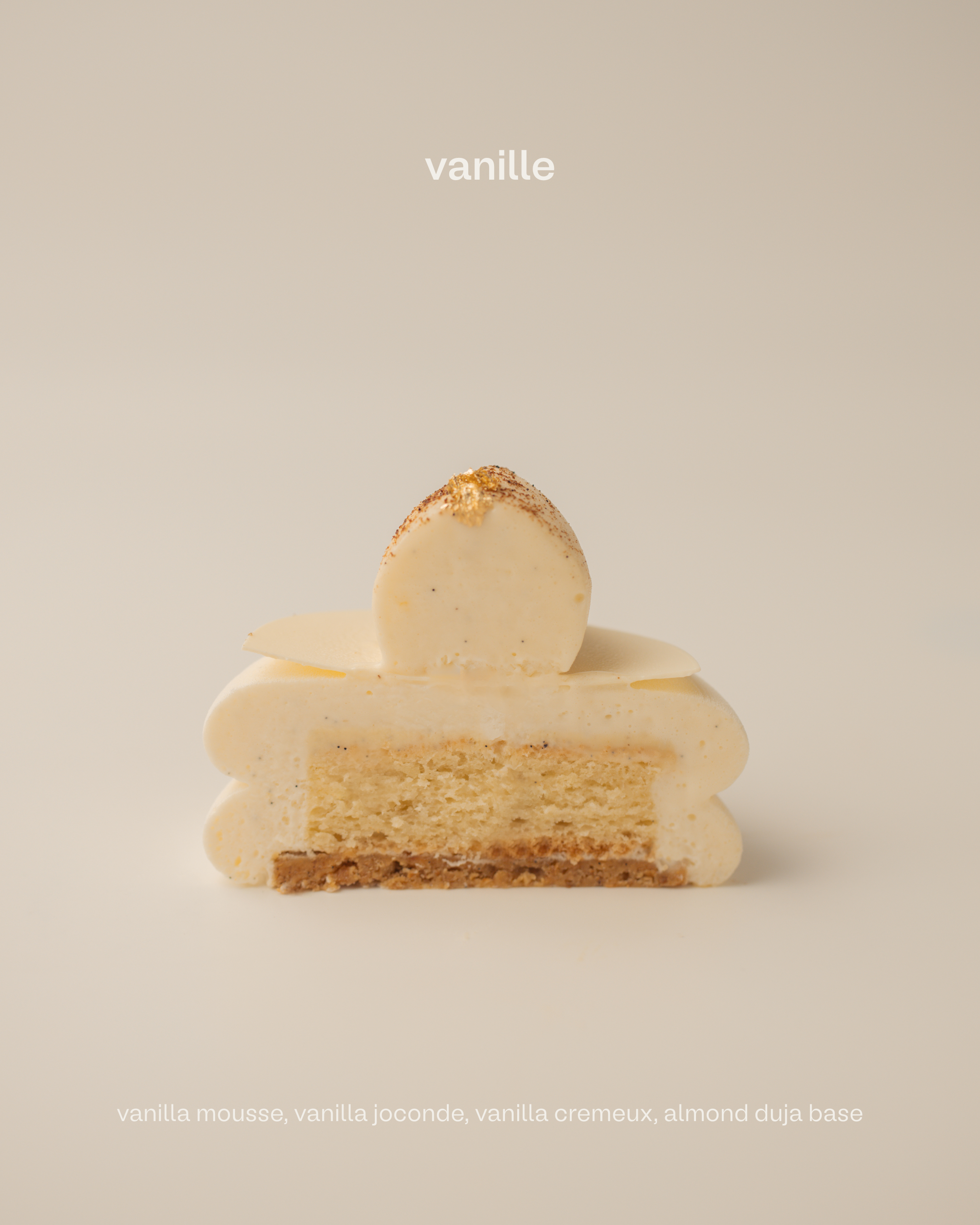 : All things vanilla, with specks of vanilla bean throughout. Vanilla mousse over tender vanilla joconde and silky vanilla cremeux, resting on a smooth almond duja base. Pure, warm, and elegant.