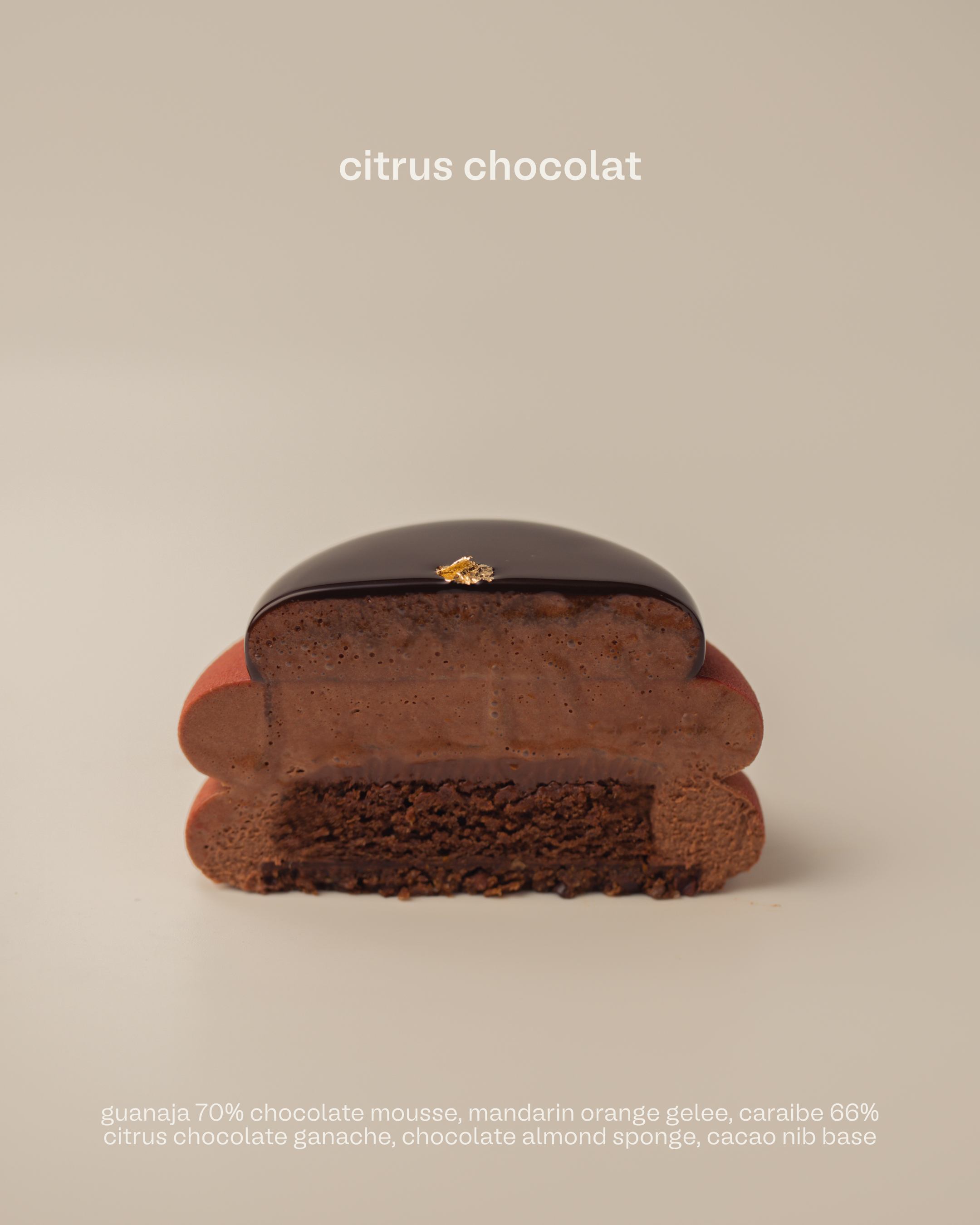 Citrus Chocolat: Intense, aromatic dark chocolate brightened with a citrus lift. Guanaja 70% chocolate mousse and Caraïbe 66% citrus chocolate ganache meet mandarin orange gelée, on chocolate almond sponge with a cacao nib base.
