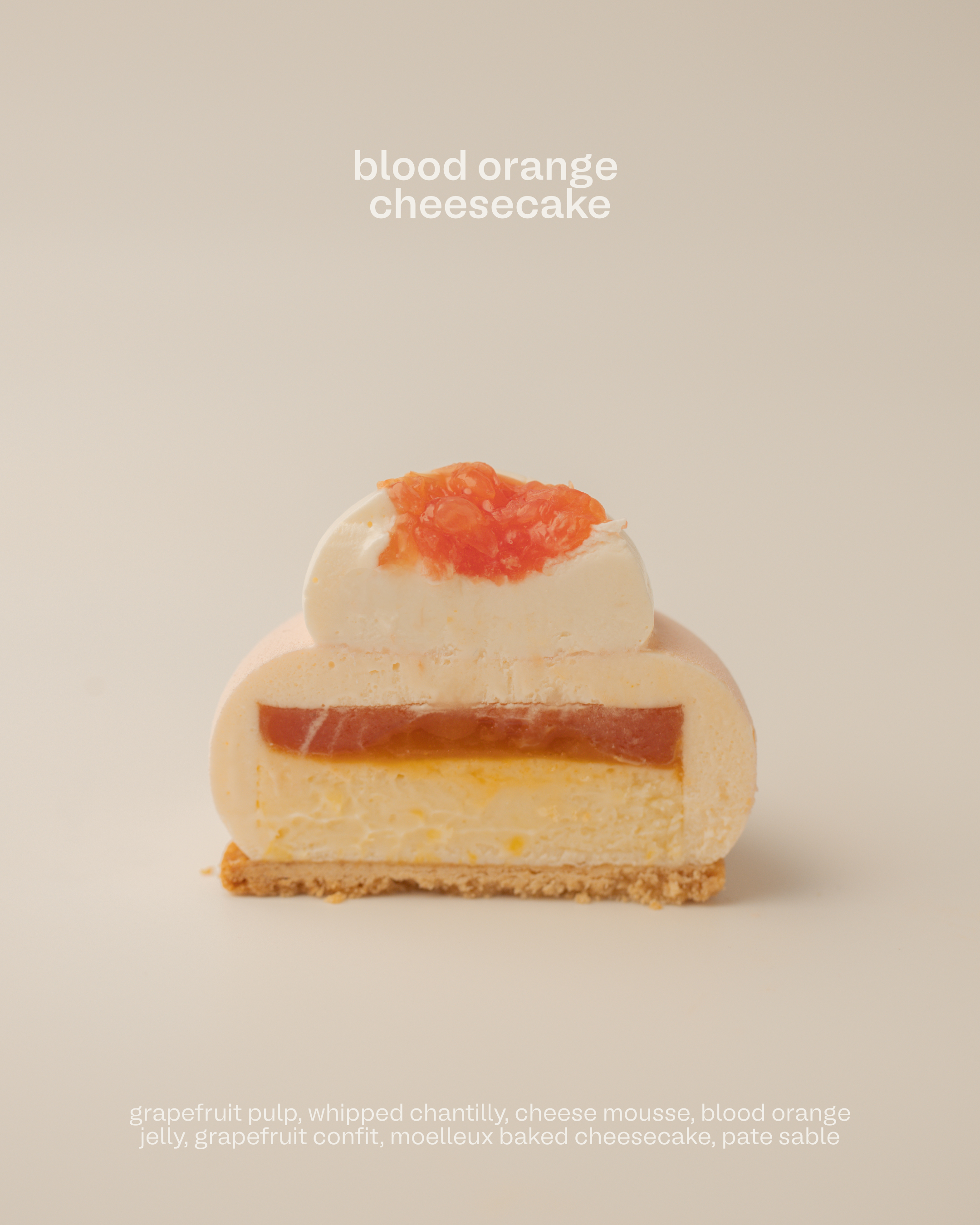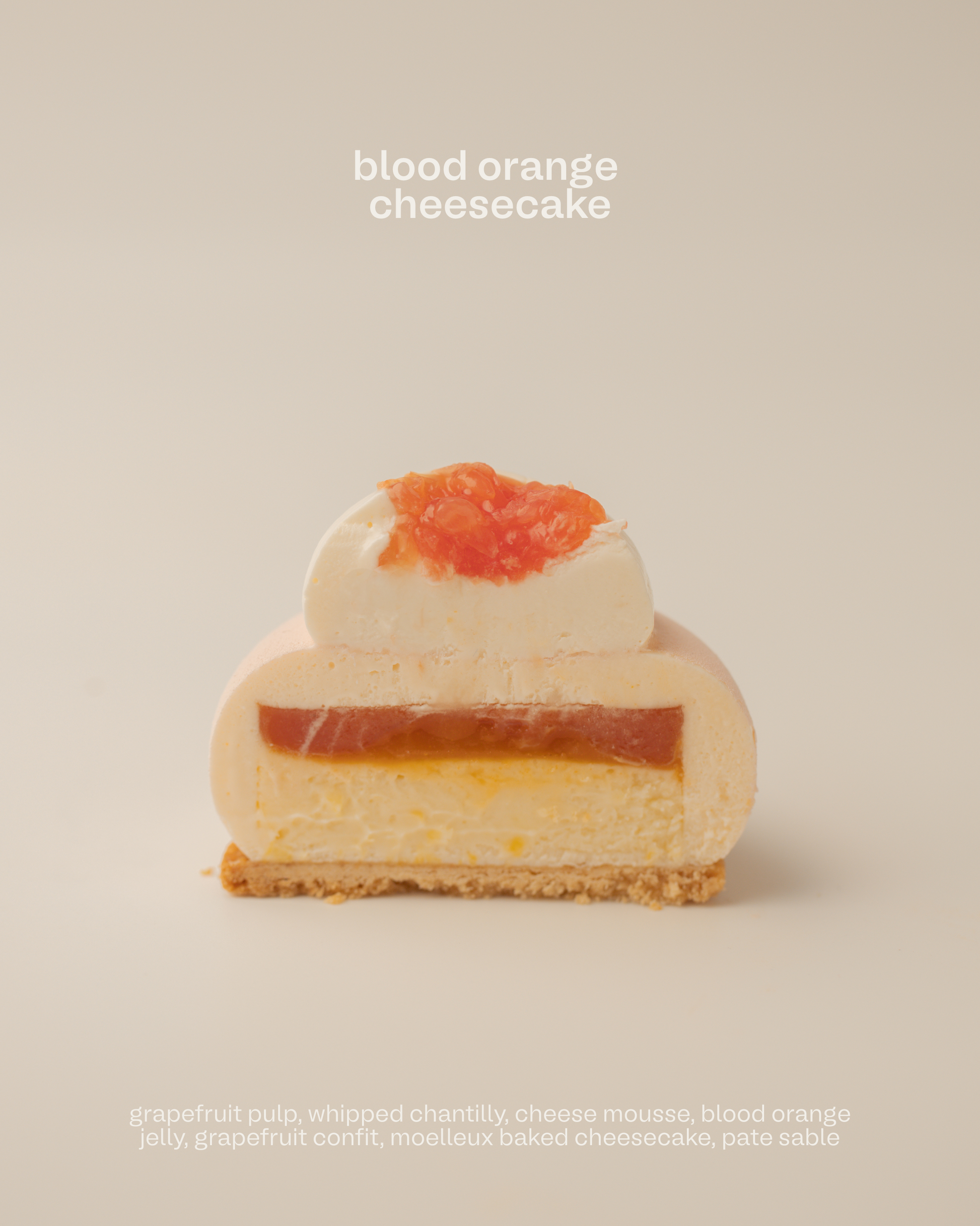 Blood Orange Cheesecake: Light, creamy, and tangy. Moelleux baked cheesecake layered with cheese mousse and whipped chantilly, sandwiched between blood orange jelly and grapefruit confit. Finished with airy chantilly and bursts of fresh grapefruit pulp.